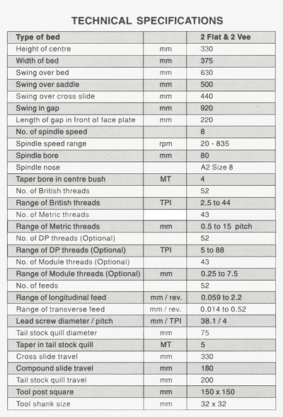 | Taper in tail stock quill | MT | 5 |